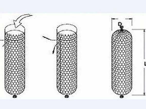 塞克格宾是由网片卷成布袋一样的圆柱状丝网,用边丝绑紧。将边缘相邻网孔和边丝用绑丝缠绕,只要圆柱体侧面绑好,再将两个底缠紧,塞克格宾即可用。缝边时圆柱体侧面要留下装石料的开口,同时缝边、装石时也要注意保护网丝表面涂层,避免将其损坏。