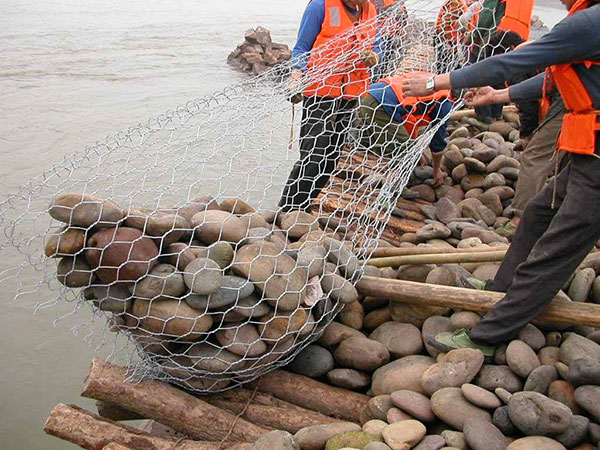 绑好后,用机器小心将塞克格宾一个一个或两个两个的吊放到恰当位置。为了保证质量,石笼网缝边、组装时应用较粗的边丝和绑丝。